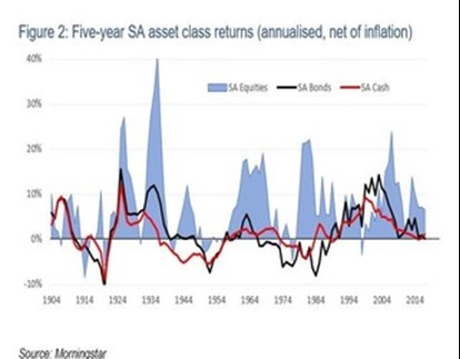 Figure 2 tracks the 5-year annualised return (net of inflation) for South African (SA) equities, bonds and cash since 1900. Two things stand out. First, the annualised real share market return over five years was almost never negative. It’s happened only once over the last 40 years.